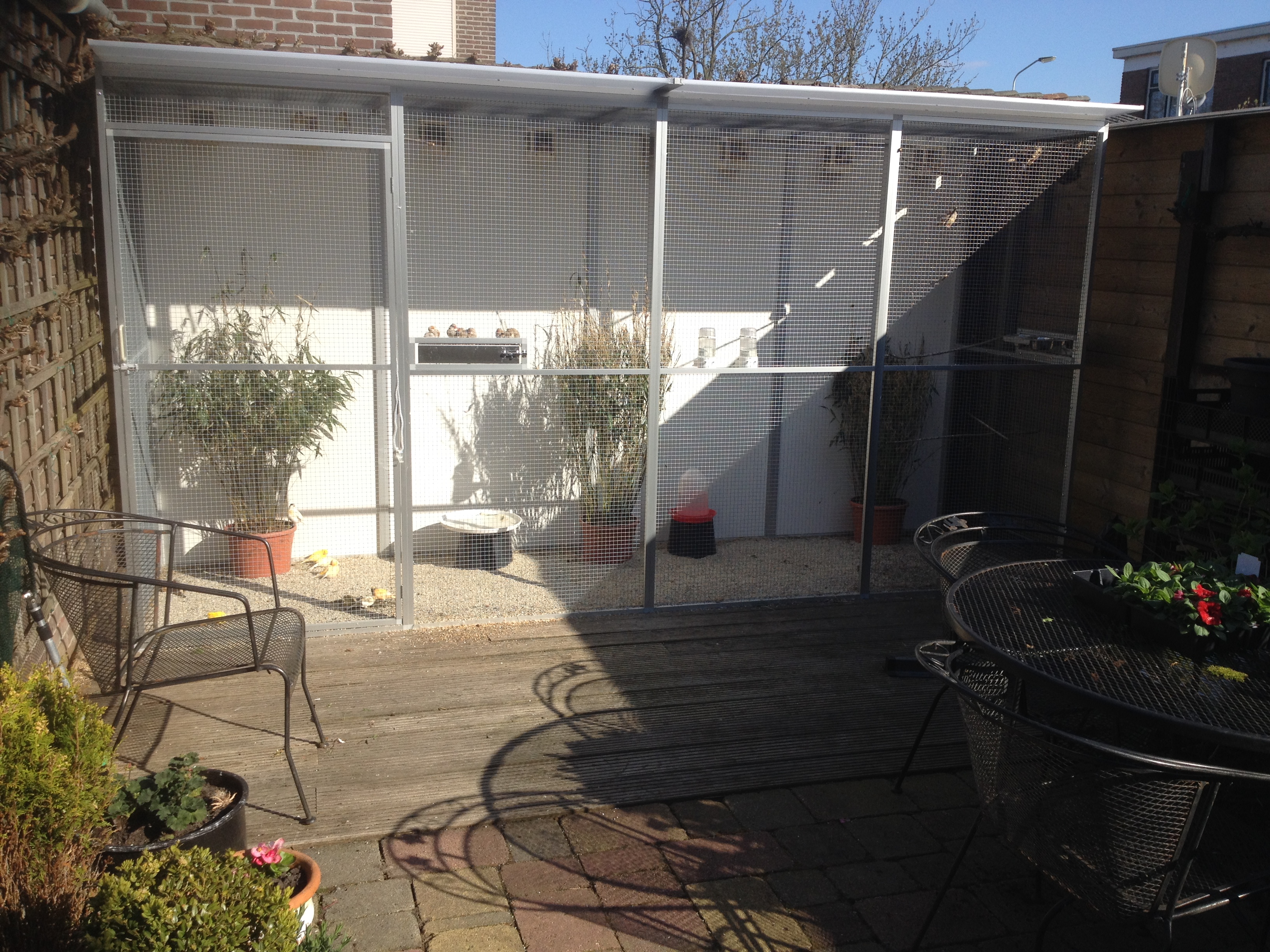 Deze voliere is een zogenaamd muurmodel in bruut aluminium. Ziet er goed uit uiteraard wensen wij deze klant nog jaren plezier van hun zeer mooie voliere.