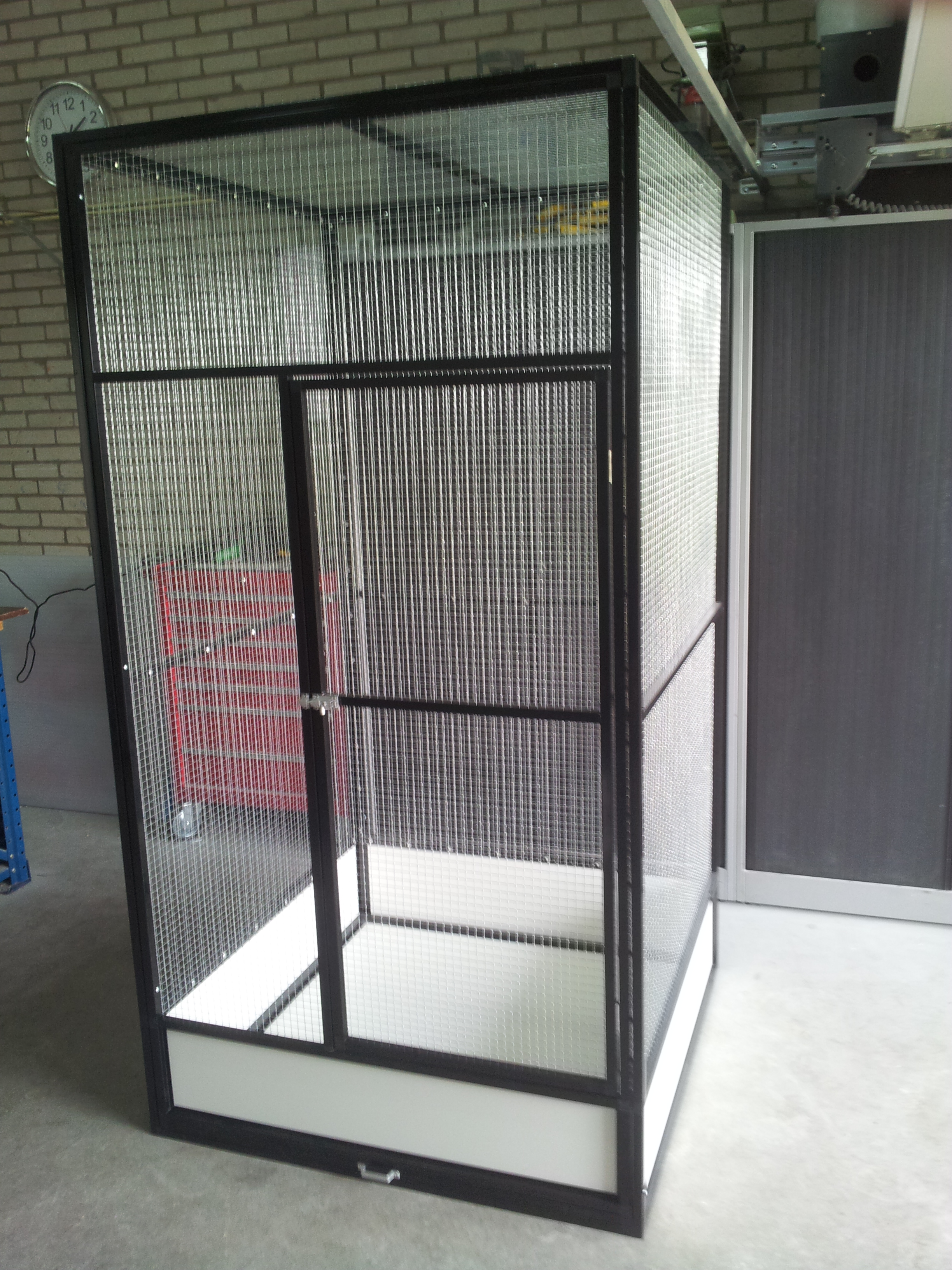 De kooi is poedergecoated zwart en op maat gemaakt voor deze klant, bespannen met 16 x 16 x 1,2 esafort gaas.
