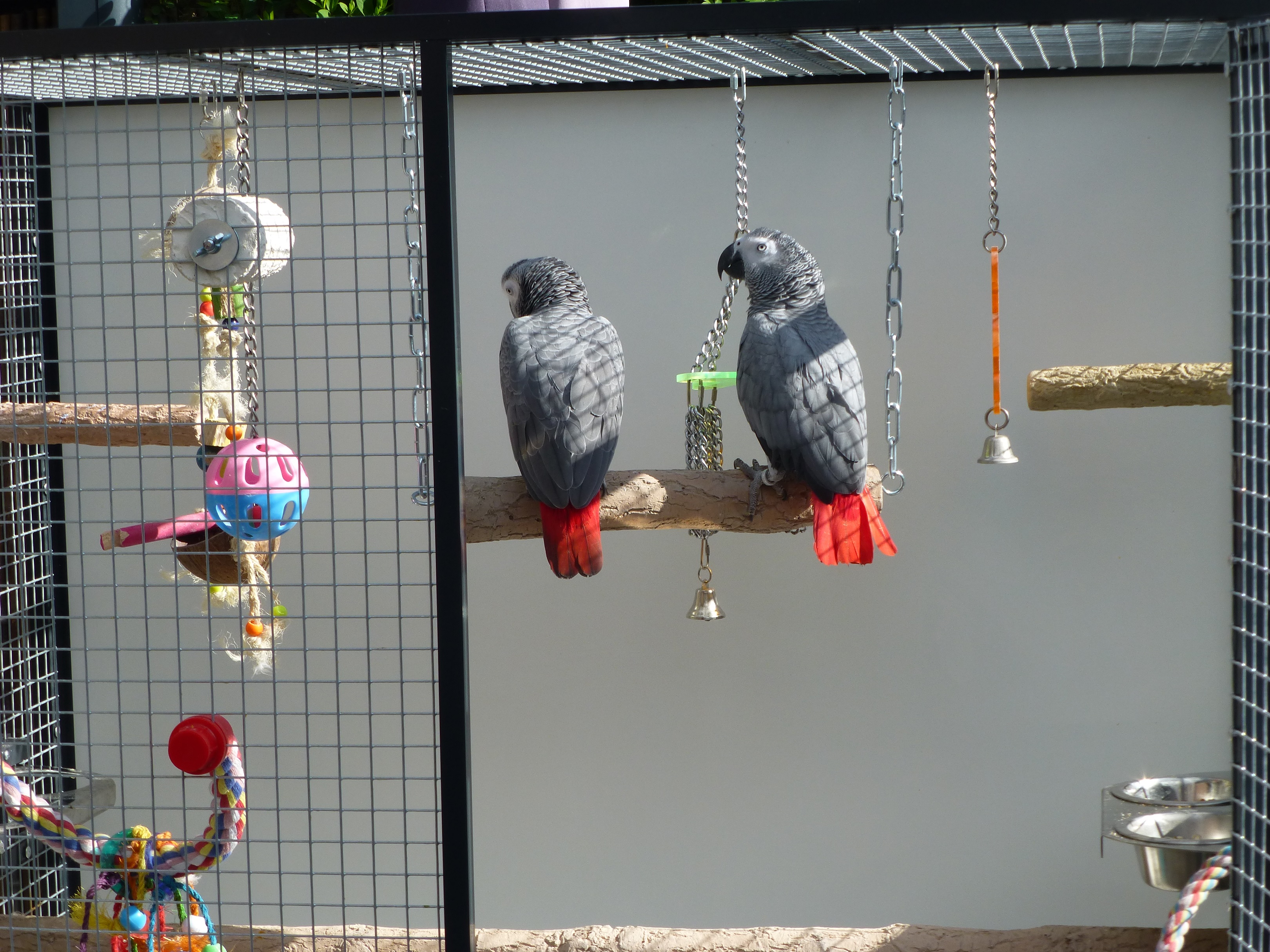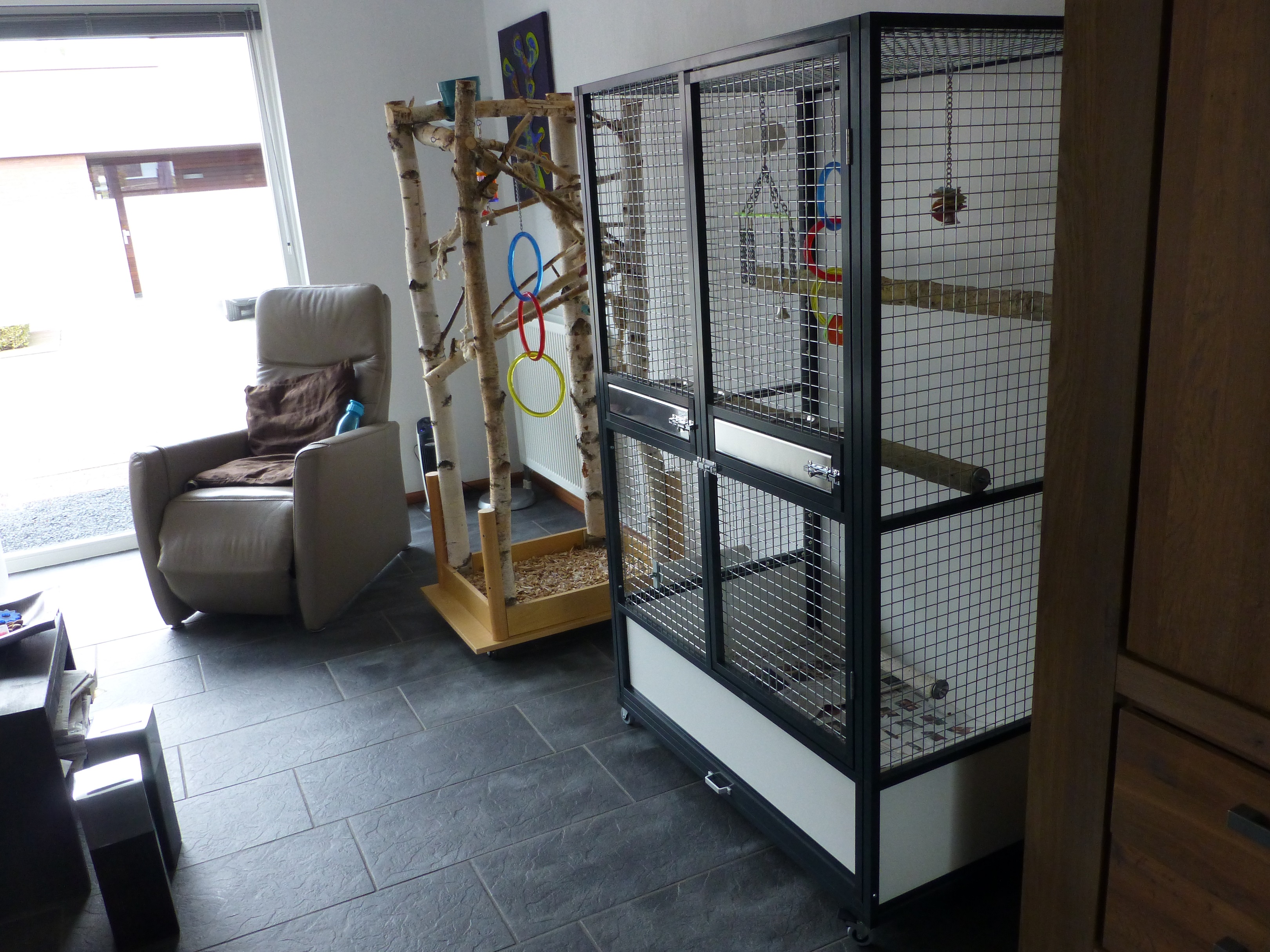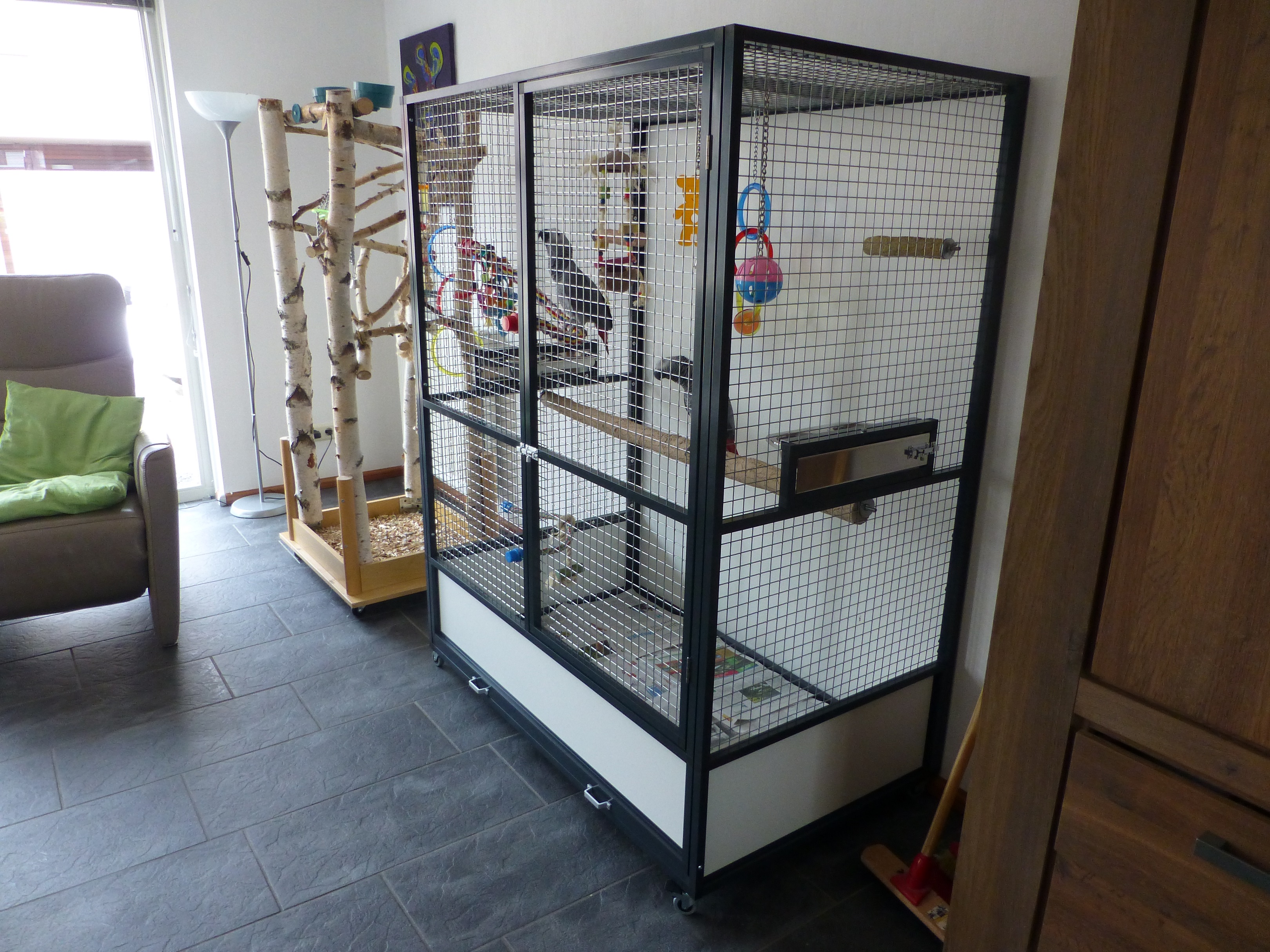 Onderstaande foto's zijn afkomstig van een klant uit Sittard waar wij een poedergecoated antraciet aluminium papegaaienkooi met 25.4 x 25.4 x 2.05 esafort gaas voor zijn 2 grijze roodstaart papegaaien hebben gemaakt.