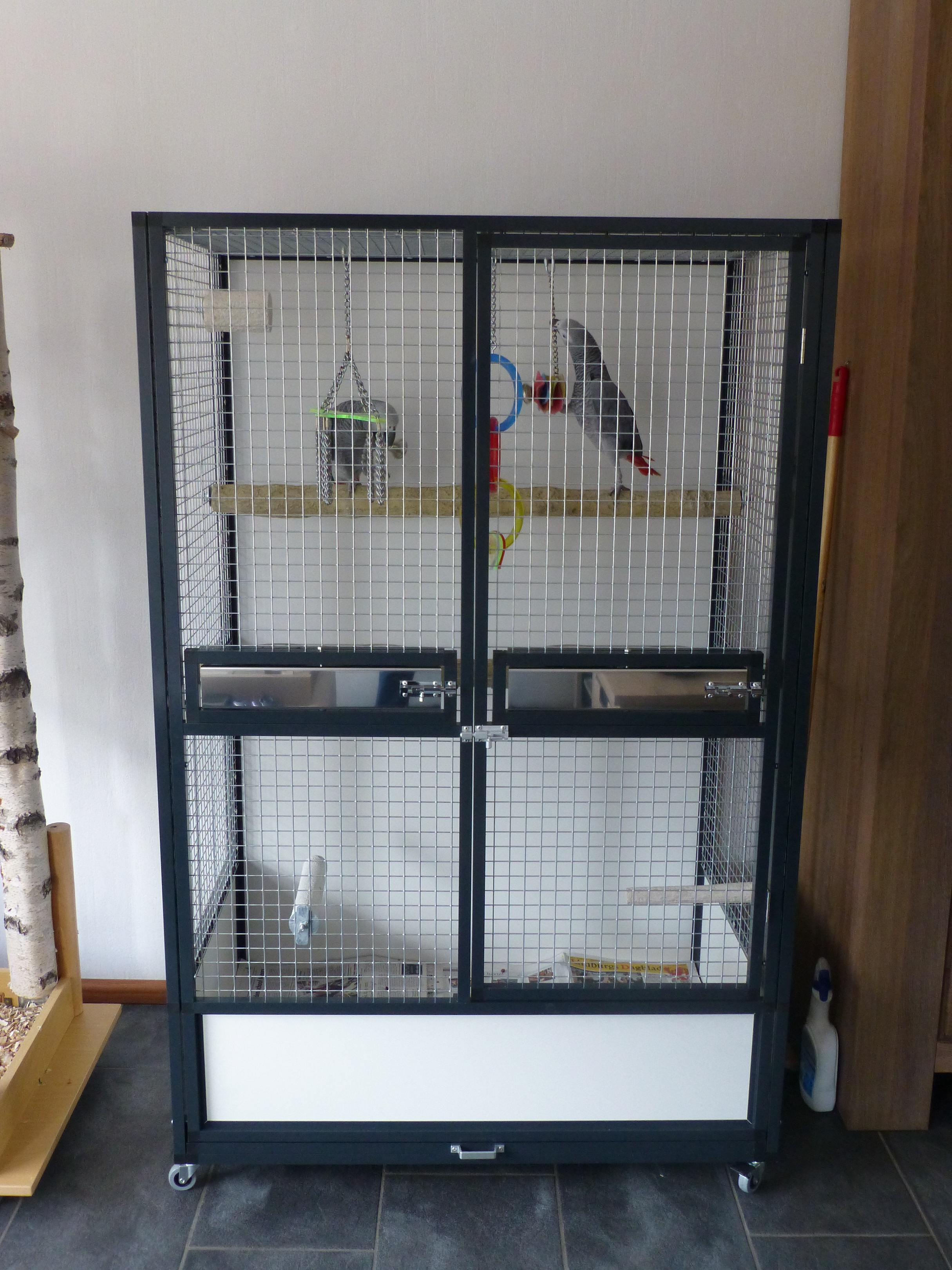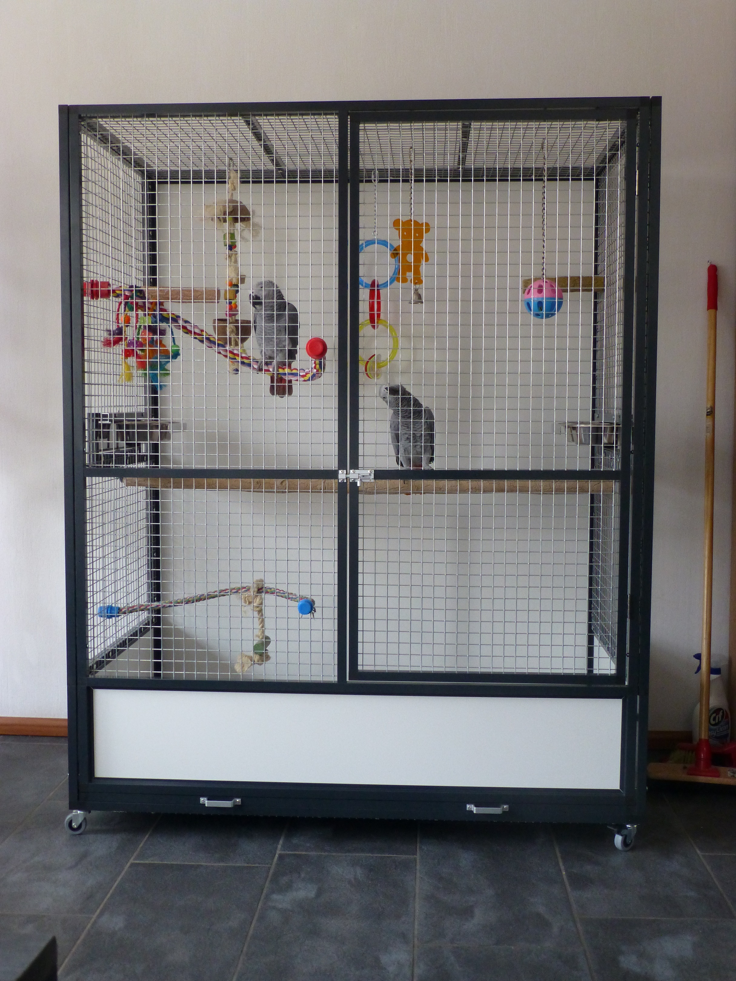 Deze kooi is poedergecoated antraciet aluminium papegaaienkooi met 25.4 x 25.4 x 2.05 esafort gaas welke wij voor zijn 2 grijze roodstaart papegaaien hebben gemaakt.