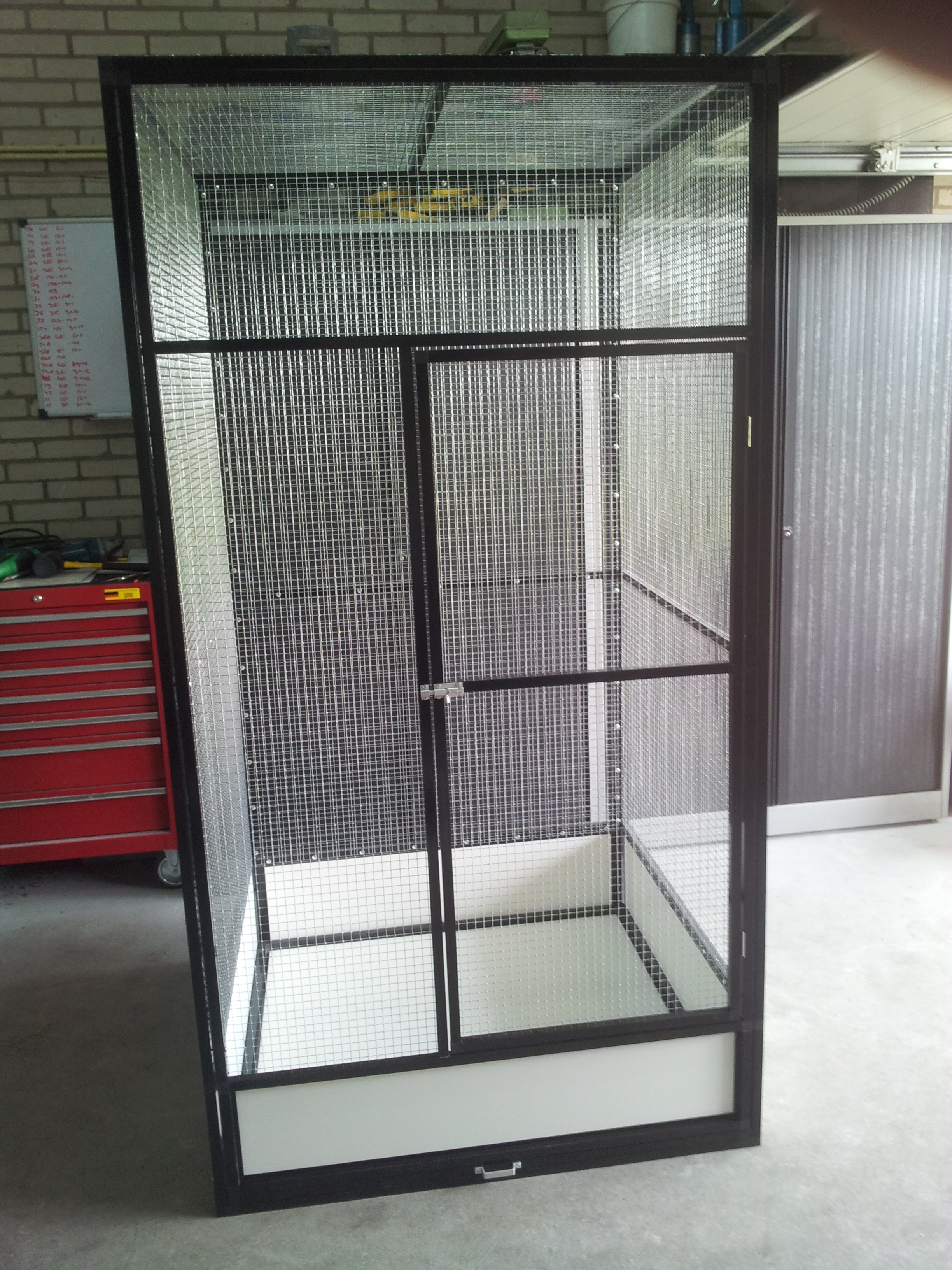 Deze kooi is poedergecoated antraciet aluminium papegaaienkooi met 25.4 x 25.4 x 2.05 esafort gaas welke wij voor zijn 2 grijze roodstaart papegaaien hebben gemaakt.