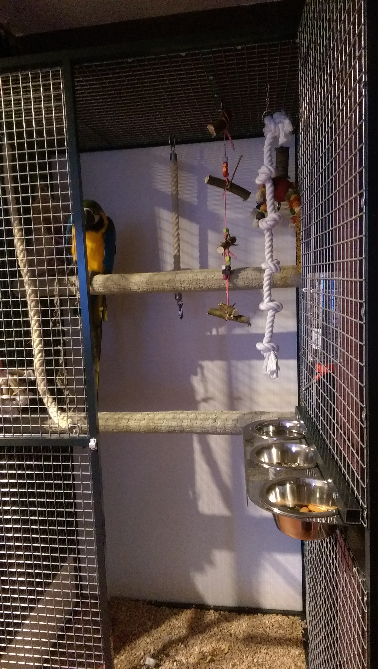 Onderstaande 2 foto's zijn afkomstig van een klant uit Hellevoetsluis waar wij een poedergecoated antraciet aluminium papegaaienkooi met 25.4 x 25.4 x 2.05 esafort gaas voor hun blauw gele ara hebben gemaakt.