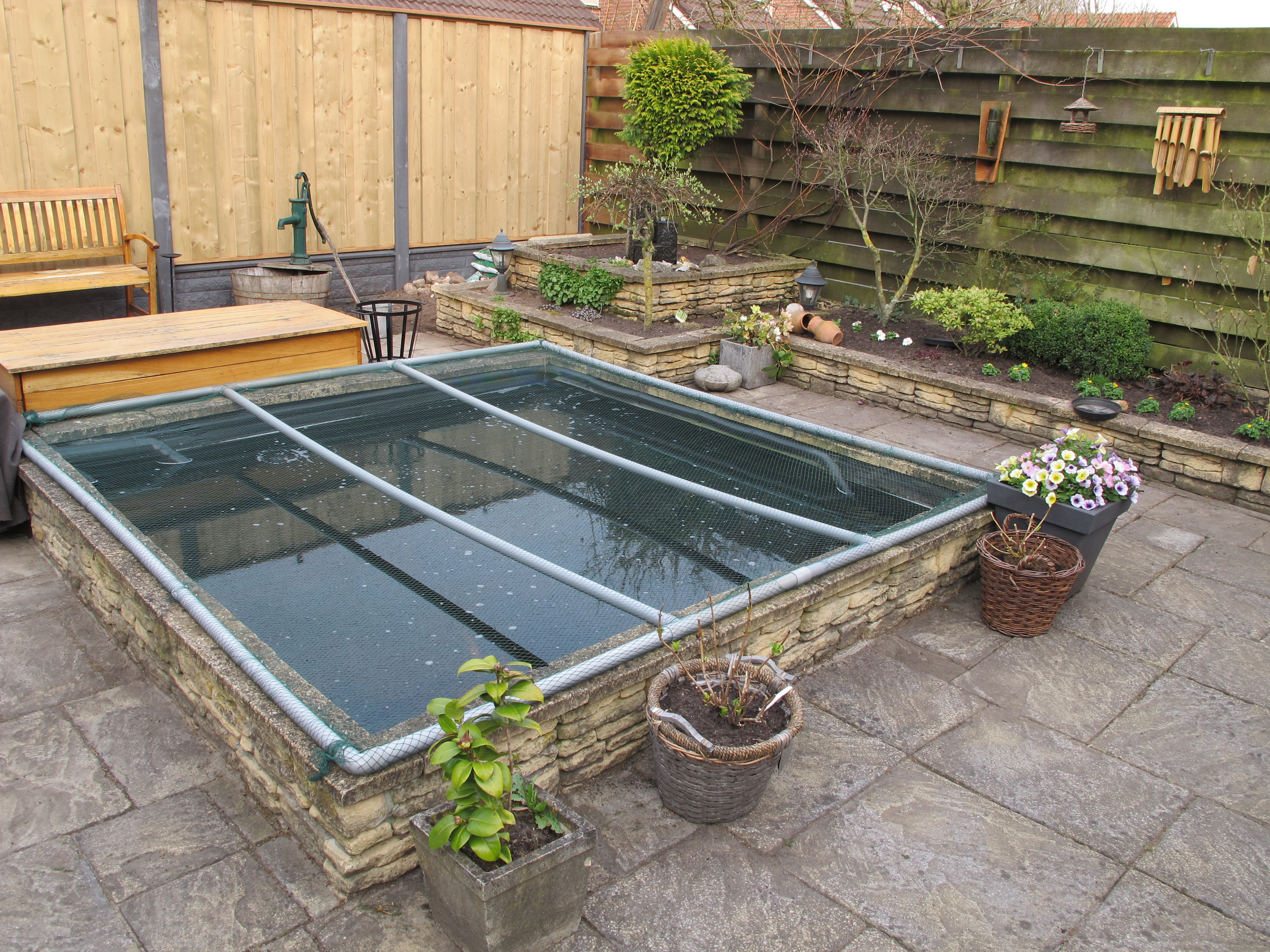 Waar wij 4 Bruut Extra vijver afdekschermen simetrisch op maat voor de klant hebben gemaakt maatvoering 4 x 71 cm x 282 cm.
