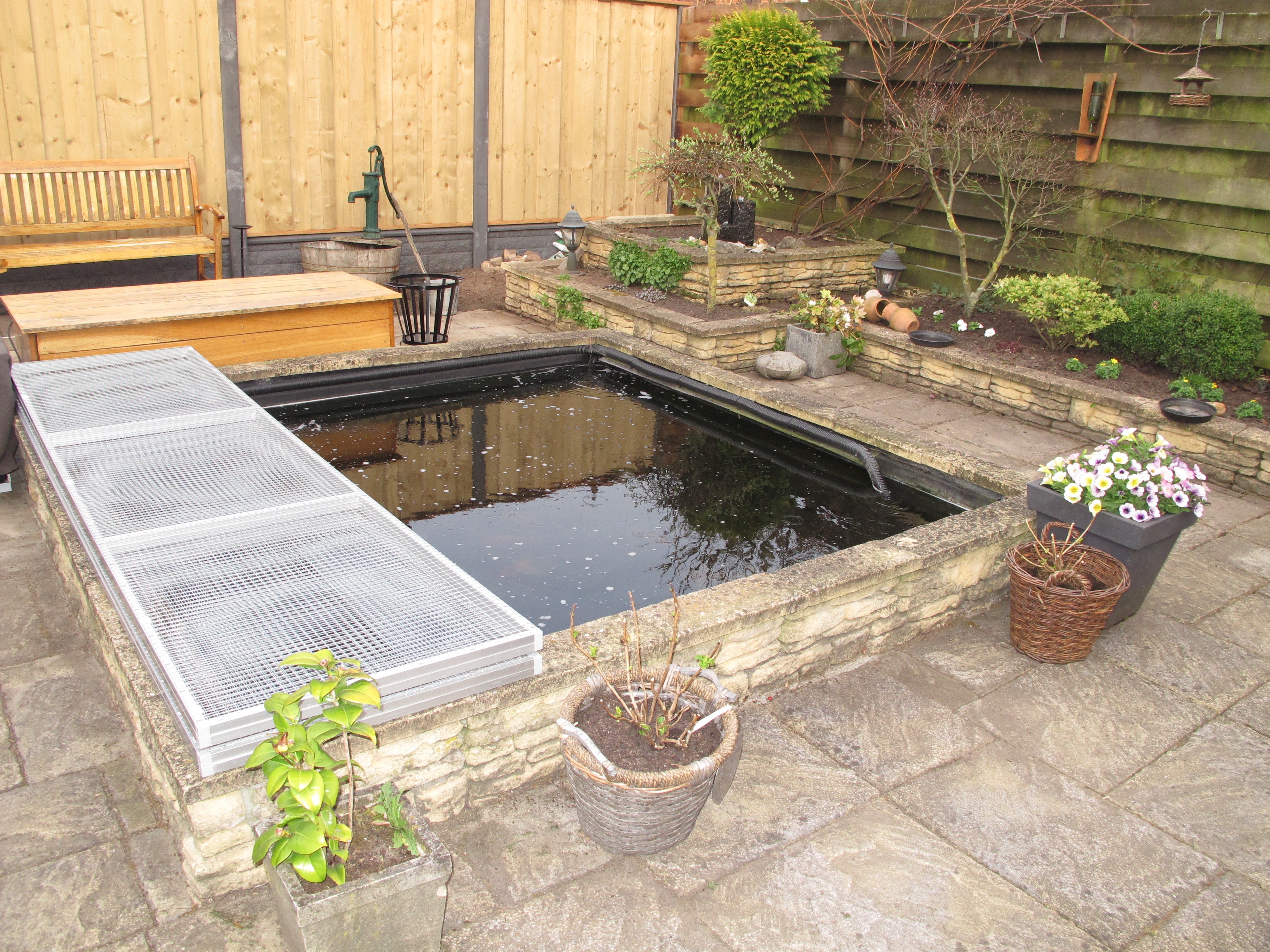 Onderstaande foto's komen van een klant uit Eindhoven waar wij 7 panelen waarvan 2 panelen op de hoeken van de vijver met 2 uitsparringen van 50 cm x 70 cm voor de planten voor hebben gebouwd.